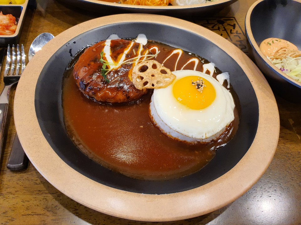 밥위에 반숙과 탱글탱글한 함박스테이크가 인상적이었는데요.