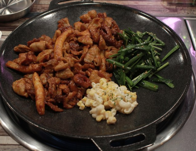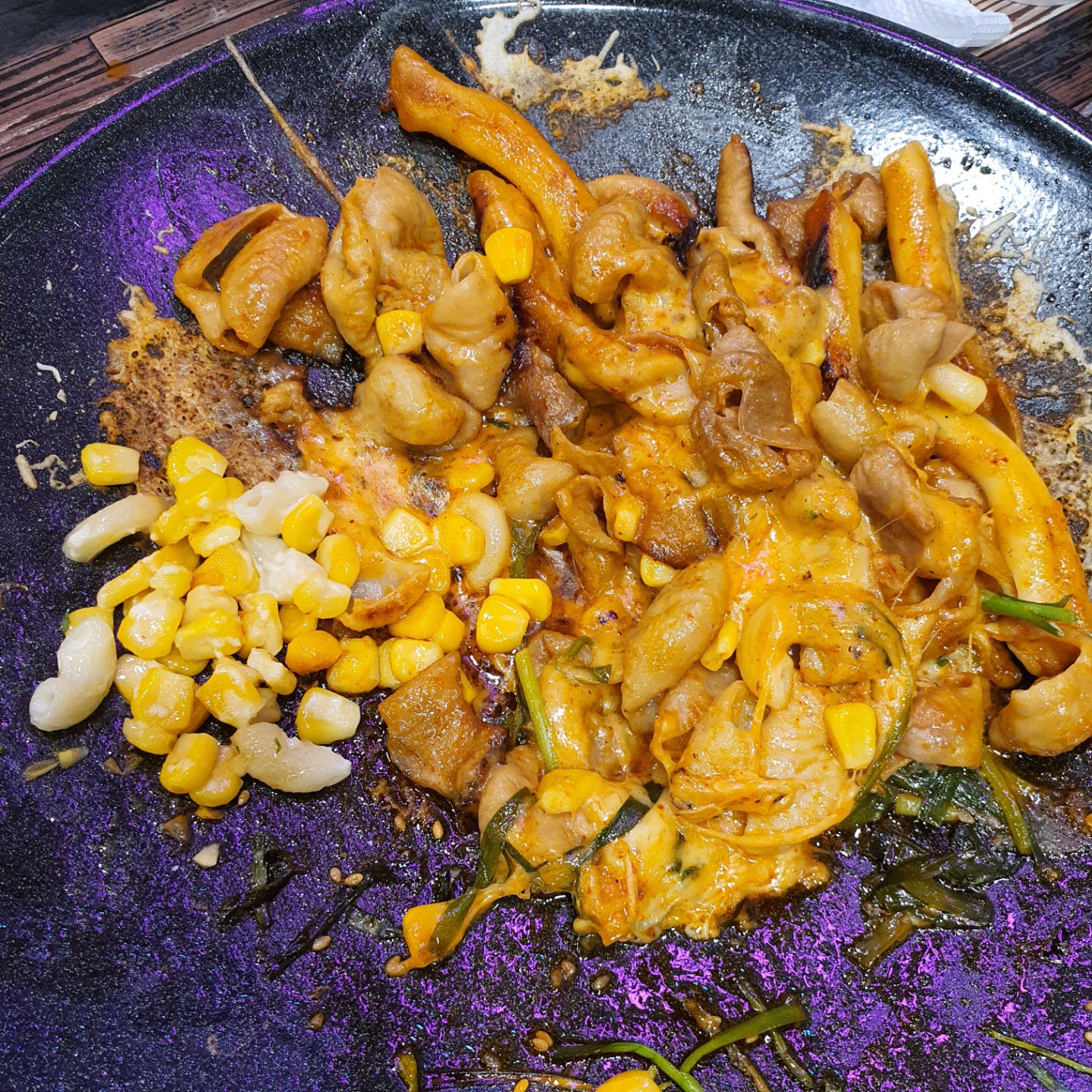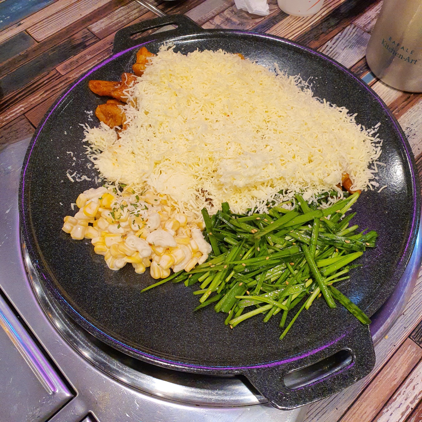 모듬이나 혹은 곱창 단품만 주문하면 부추와 옥수수콘이 함께 철판위에 올려져서 나온다.