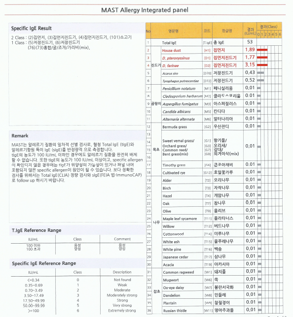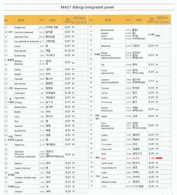 저같은 경우는 집먼지, 집먼지진드기, 소고기, 홍합, 굴, 조개, 가리비에 대하여 알러지 반응을 보일 수 있다고 나왔습니다.