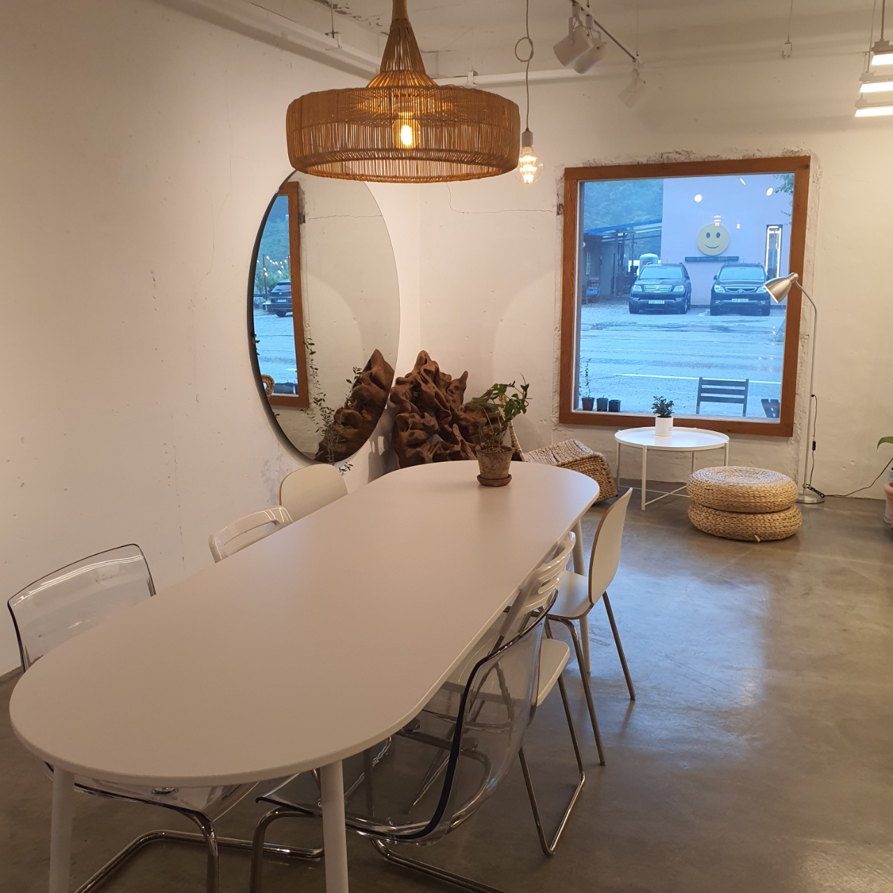 화이트와 목재의 조화가 엔틱함과 편안한 느낌을 주며, 주황색 조명이 은은하여 아무렇게 셀카를 찍어도 잘 나옵니다.