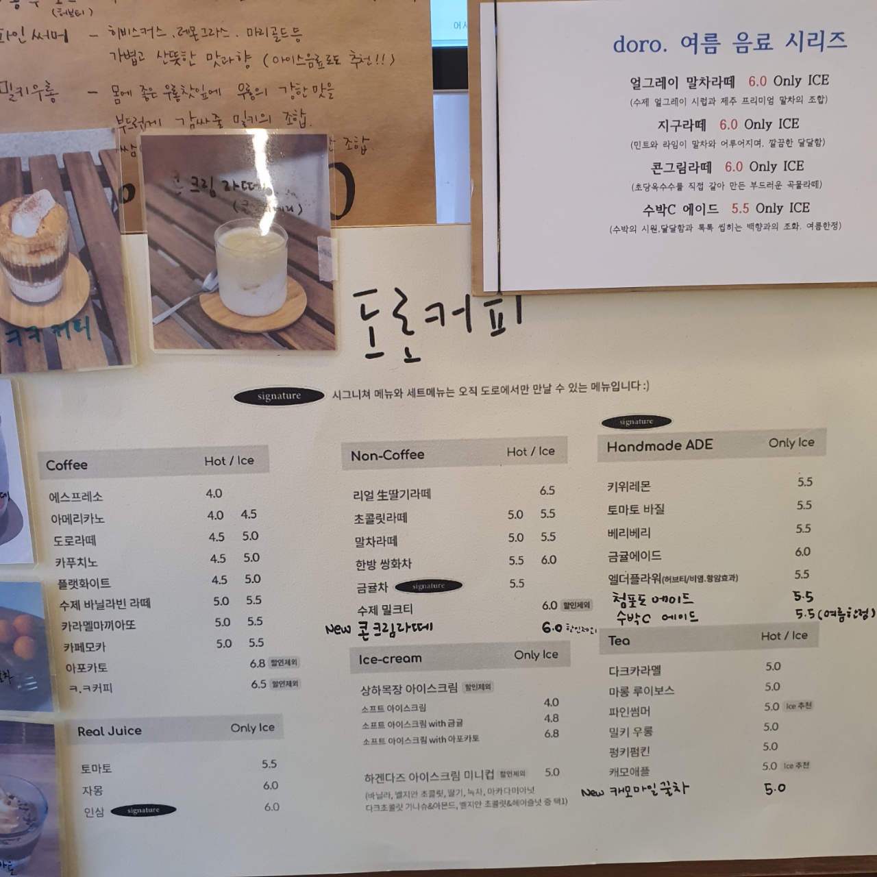 커피, 쥬스, 아이스크림, 에이트까지 다양하게 있으며, 신메뉴 콘크림라떼의 경우 직접 재배하시는 옥수수를 재료로 사양하신다고합니다.