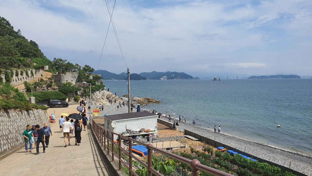 내려가는 길을 기준으로 오른쪽에는 바다, 왼쪽에는 매미성입니다.